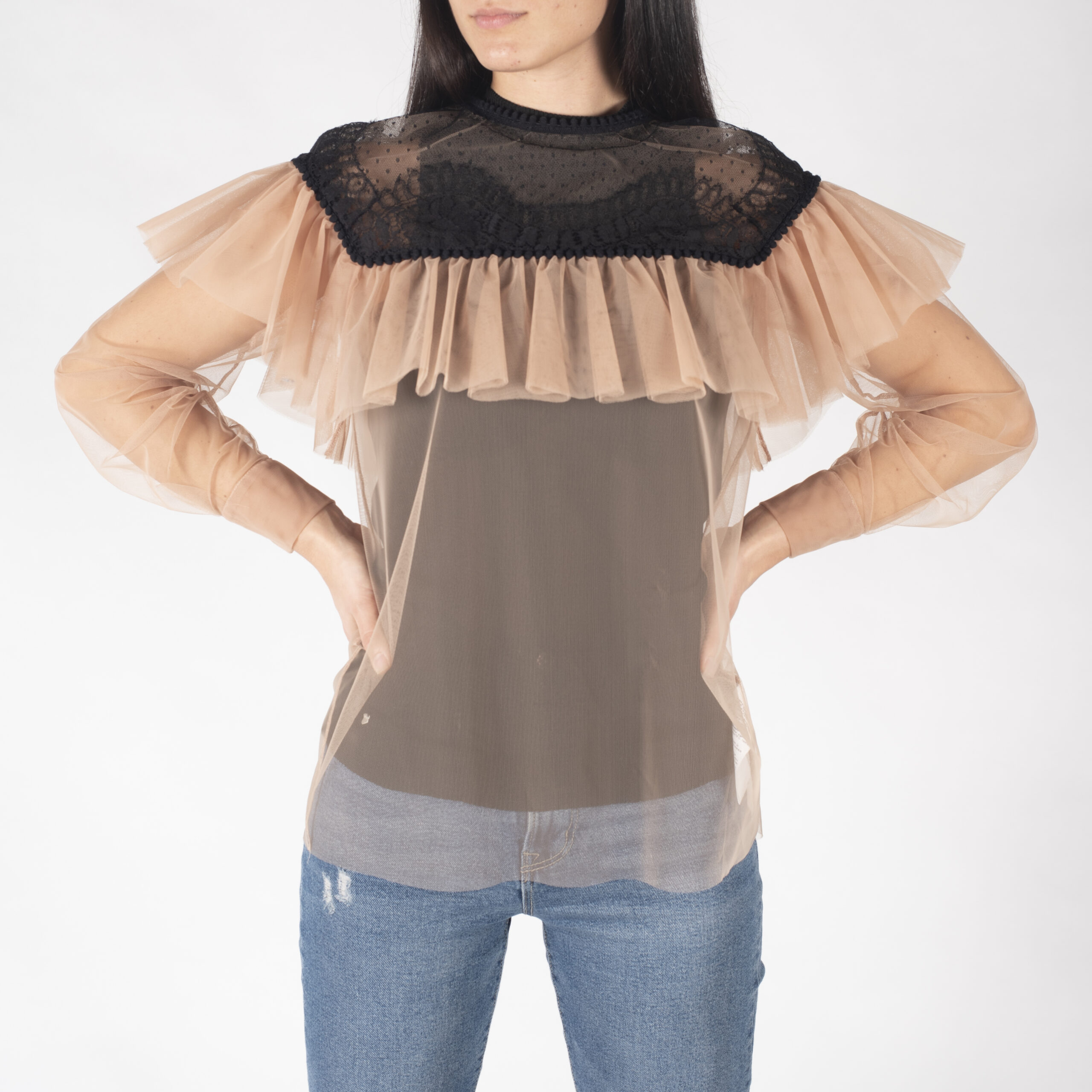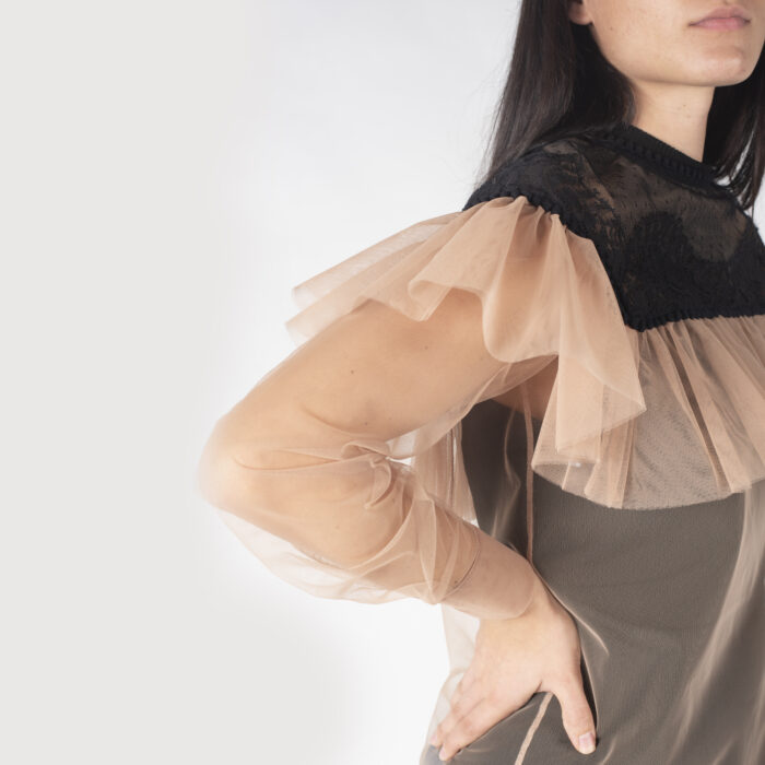 tulle, senza applicazioni, fantasia bicolore, chiusura sul retro, bottoni, maniche lunghe, collo tondo, senza tasche.